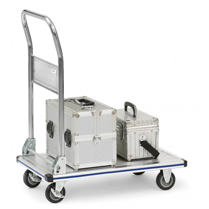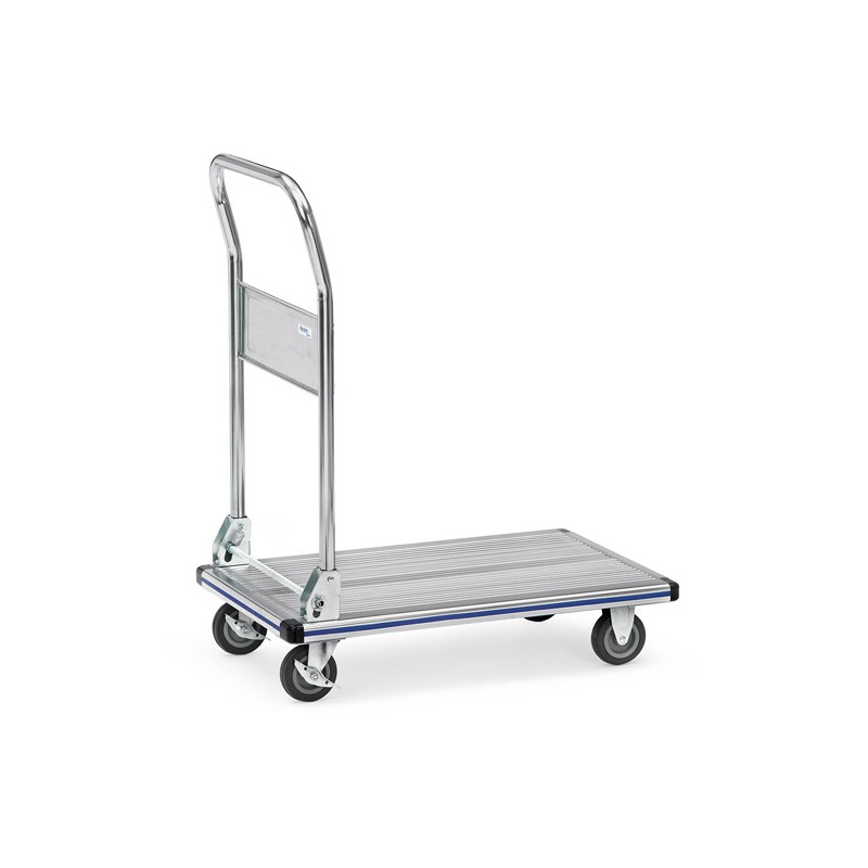 Wózek aluminiowy z antypoślizgową powierzchnią. Stabilne zaokrąglone krawędzie.Dwa koła obrotowe, dwa skrętne - gumowe. Hamulce na kołach zgodnie z normą EN 1757-3.